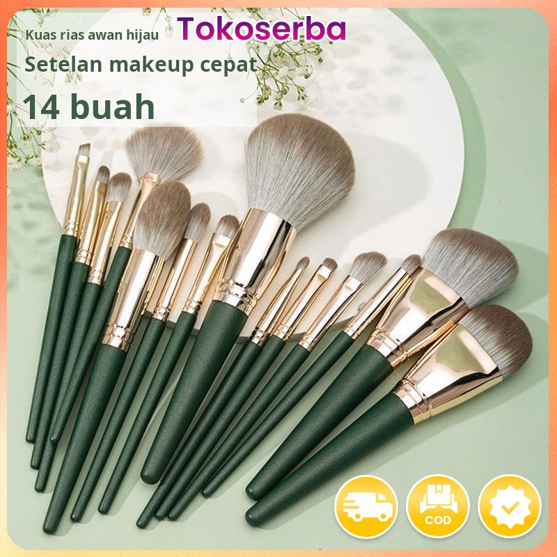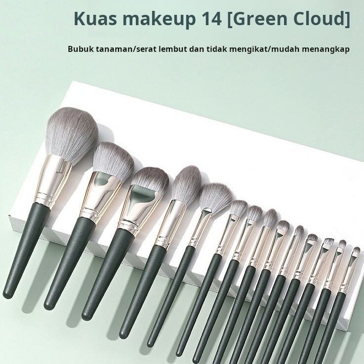 14 set kuas makeup awan hijau, kuas bedak tabur lembut, kuas eye shadow, alat kecantikan untuk pemula, set lengkap kuas