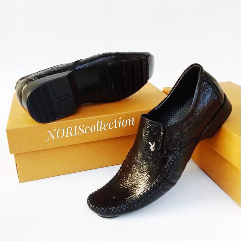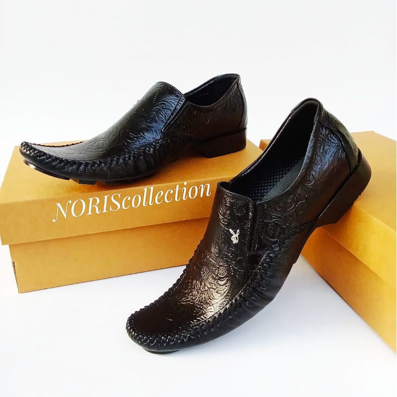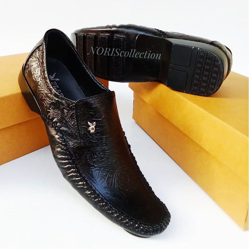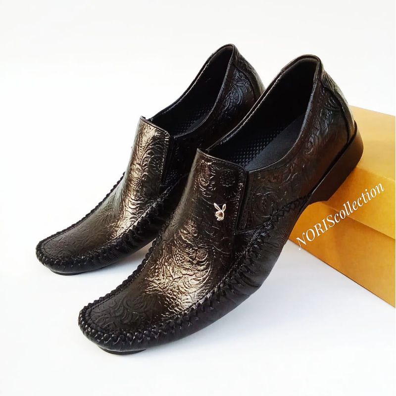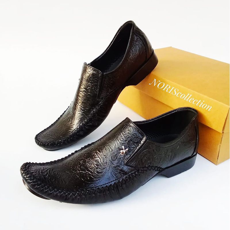 Sepatu Pantofel Playboy Pria Kulit Asli Motif Batik Slip On Original
