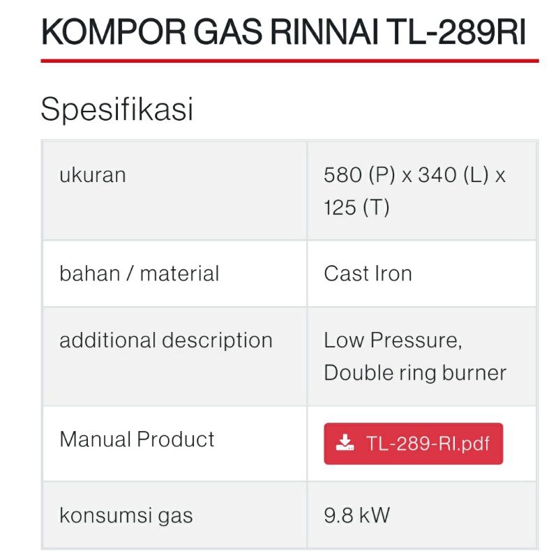 Kompor Gas Komersil Rinnai TL 289 RI Low Pressure Kompor Mawar Rinnai 289 RI Tekanan Rendah
