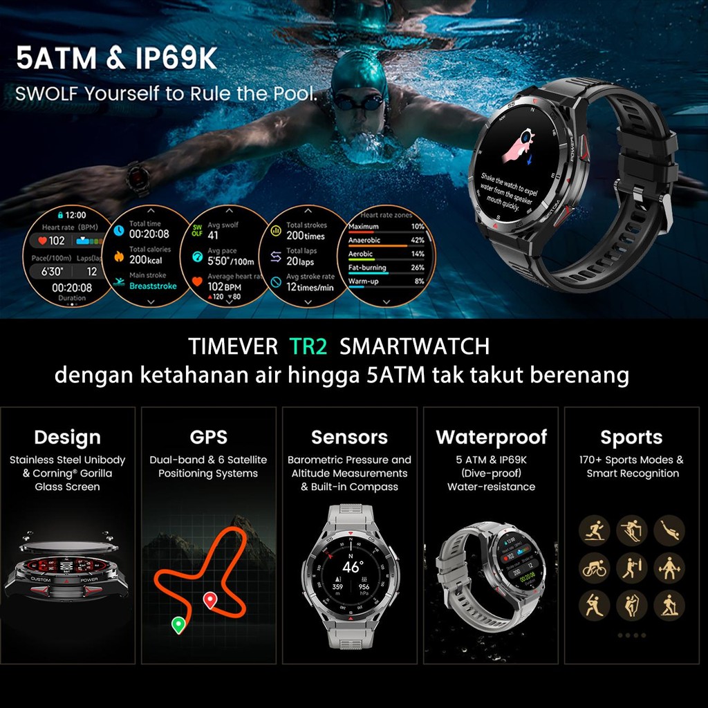 TIMEVER TR2 5ATM Built-in GPS Track Map Route Back AOD jam tangan pintar Pressure Altitude Compass Military Super Smartw