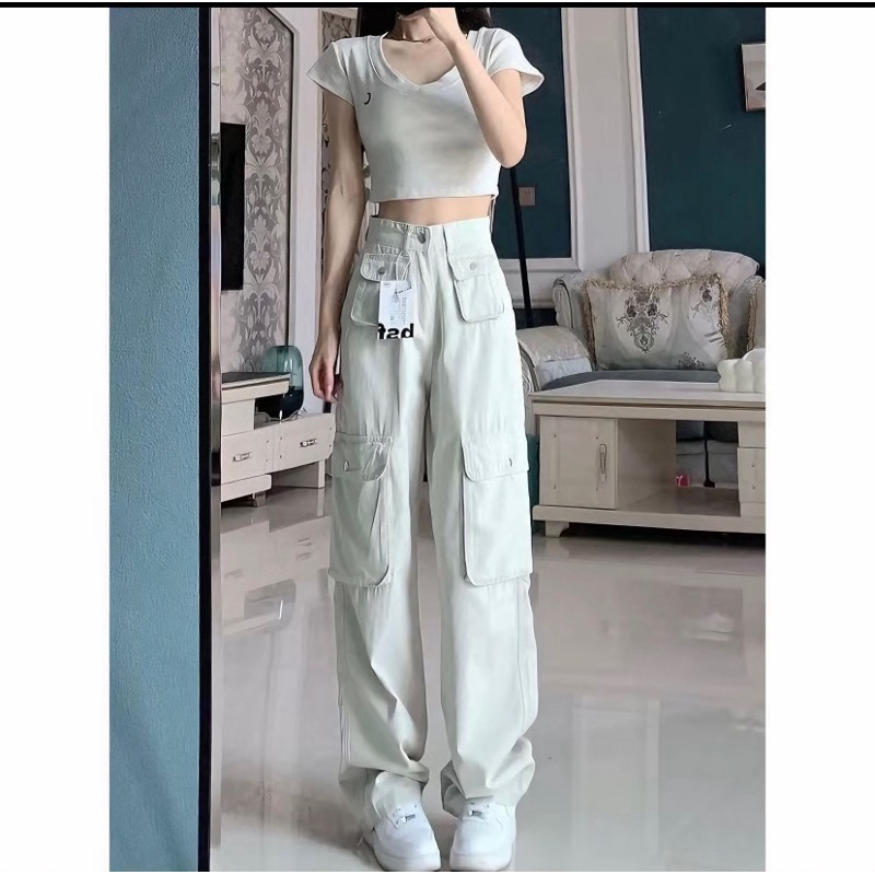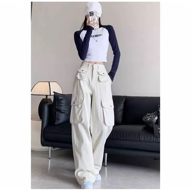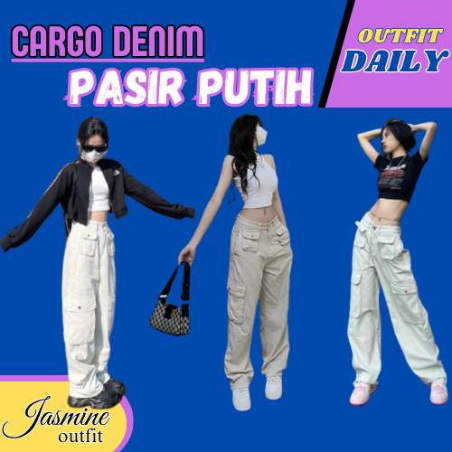 Highwaist Baggy Cargo Denim Pasir Putih - Loosepant Celana Jeans Premium Wanita Korea Terbaru