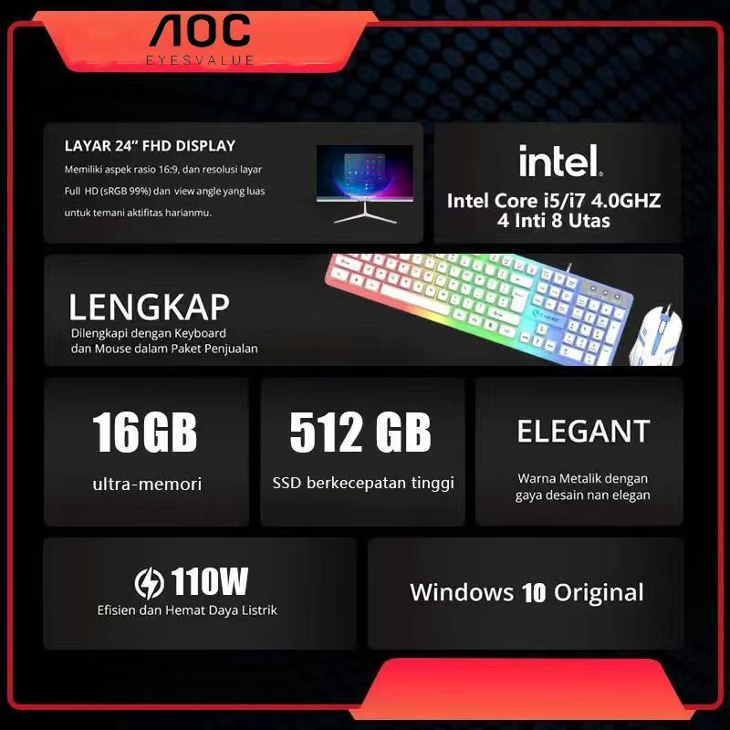 AOC Komputer Full PC All-in-One 19‘ 22’ 24‘ 27“ Baru Terbaru HD Super Tipis Intel Core i3/i5/i7 Untuk Rumah, Belajar, Ka