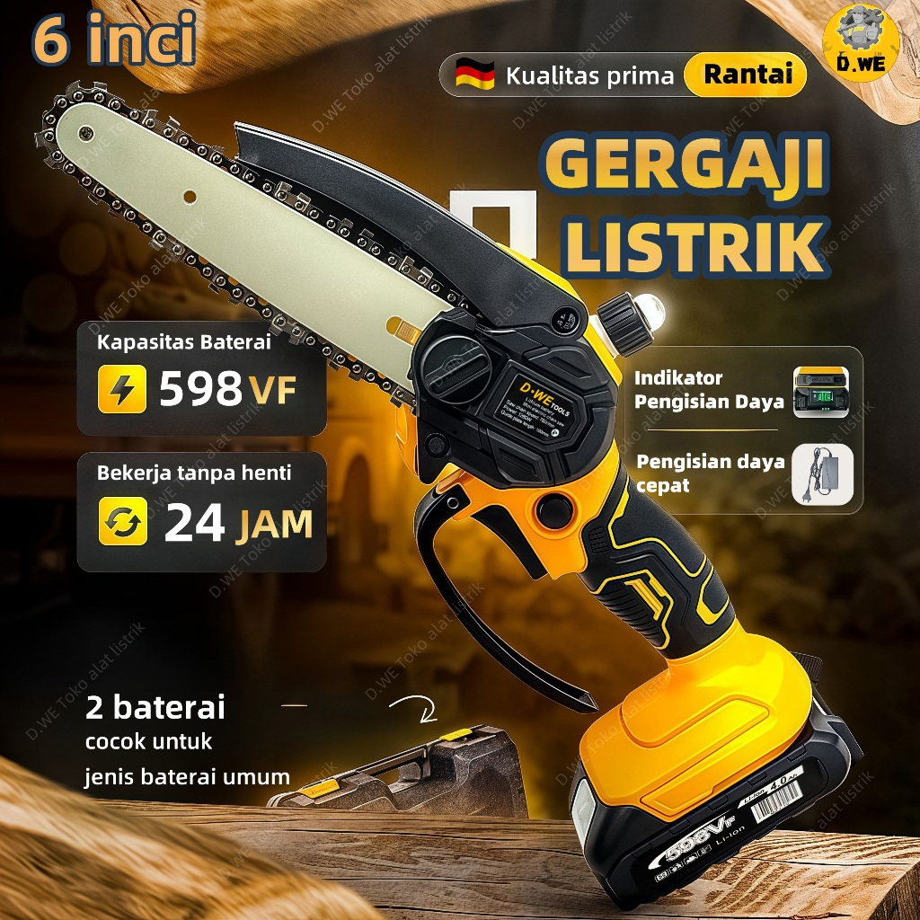 D-WE Chainsaw 6 inch Cordless Mini Chainsaw Brushless Branch Saw Wood Pruning Cutter Gergaji Elektrik Mesin P0T0NG Pokok