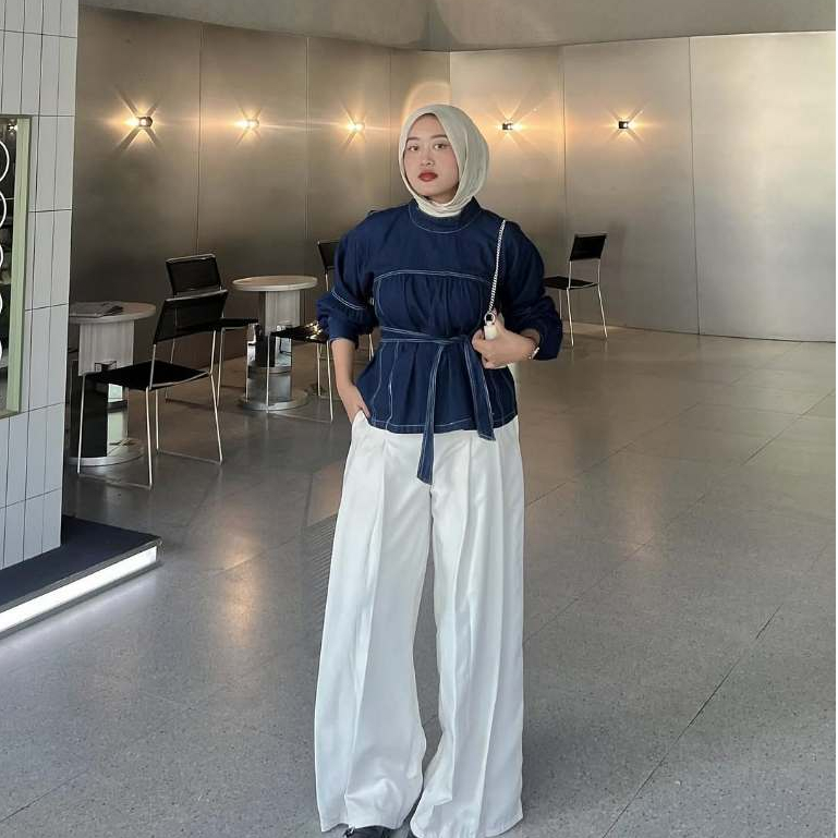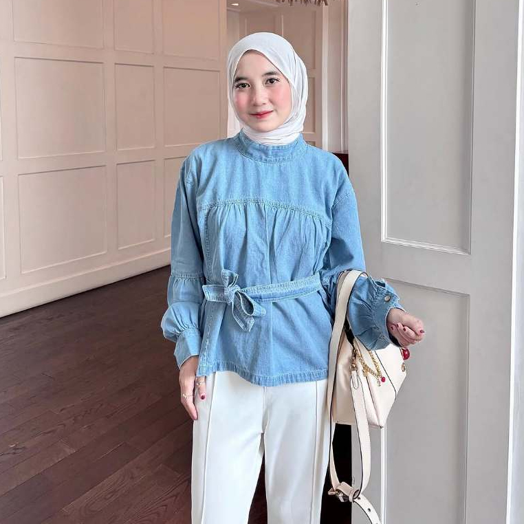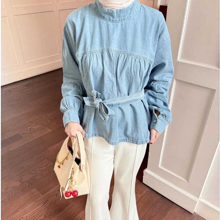 Pola Wear Blouse Denim Wanita Look Korean Style Atasan Jeans Casual Modis Ikat Pinggang Farra