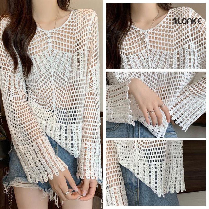 NLONKE - Baju Longgar Gaya Jorok Wanita Pakaian Rajut Kerah V Berongga Atasan Rajut Lengan Kelelawar
