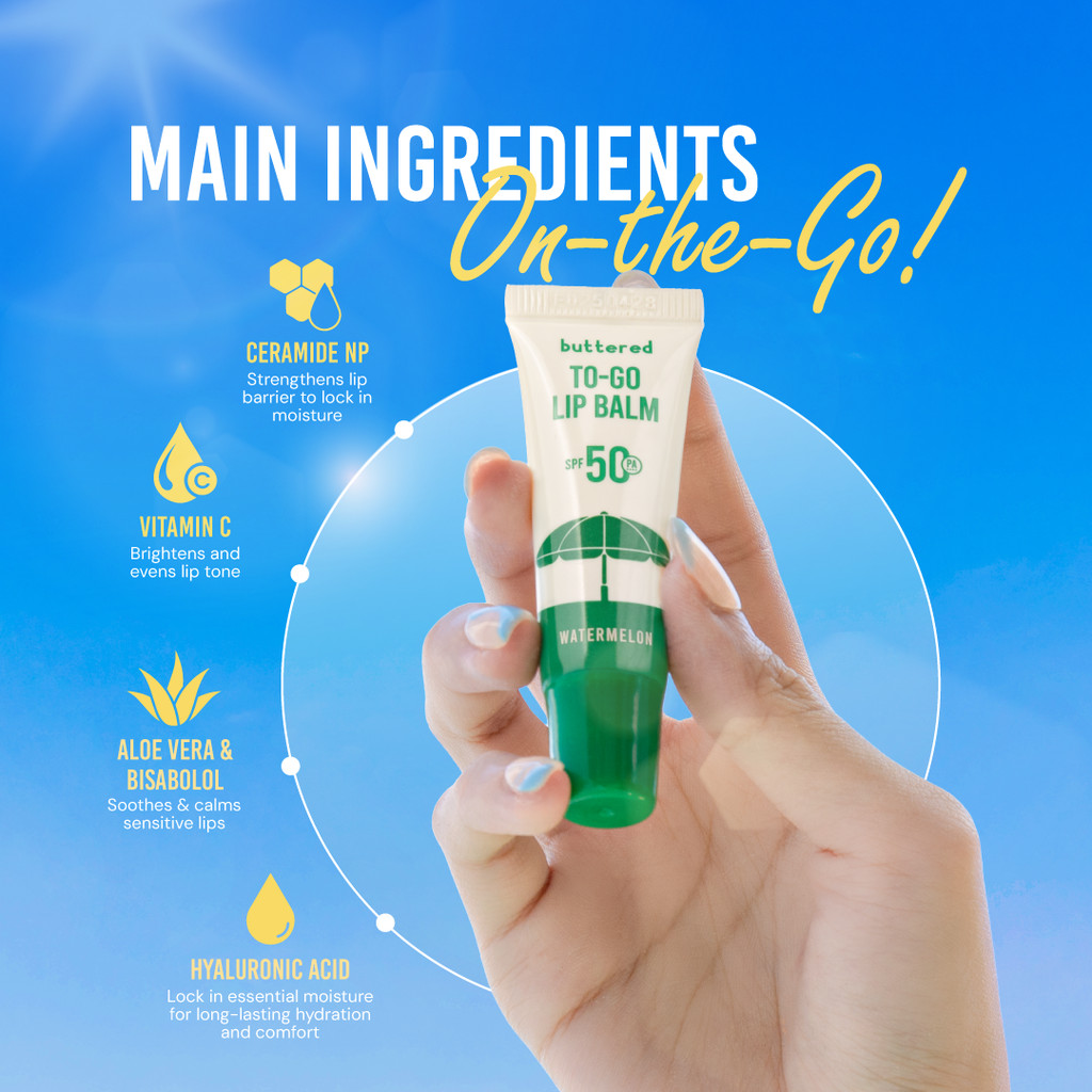 Buttered To-Go Lip Balm SPF 50 PA++++ Lip Balm dengan Perlindungan Matahari Ekstra Mencerahkan Bibir Gelap dan Menjaga K