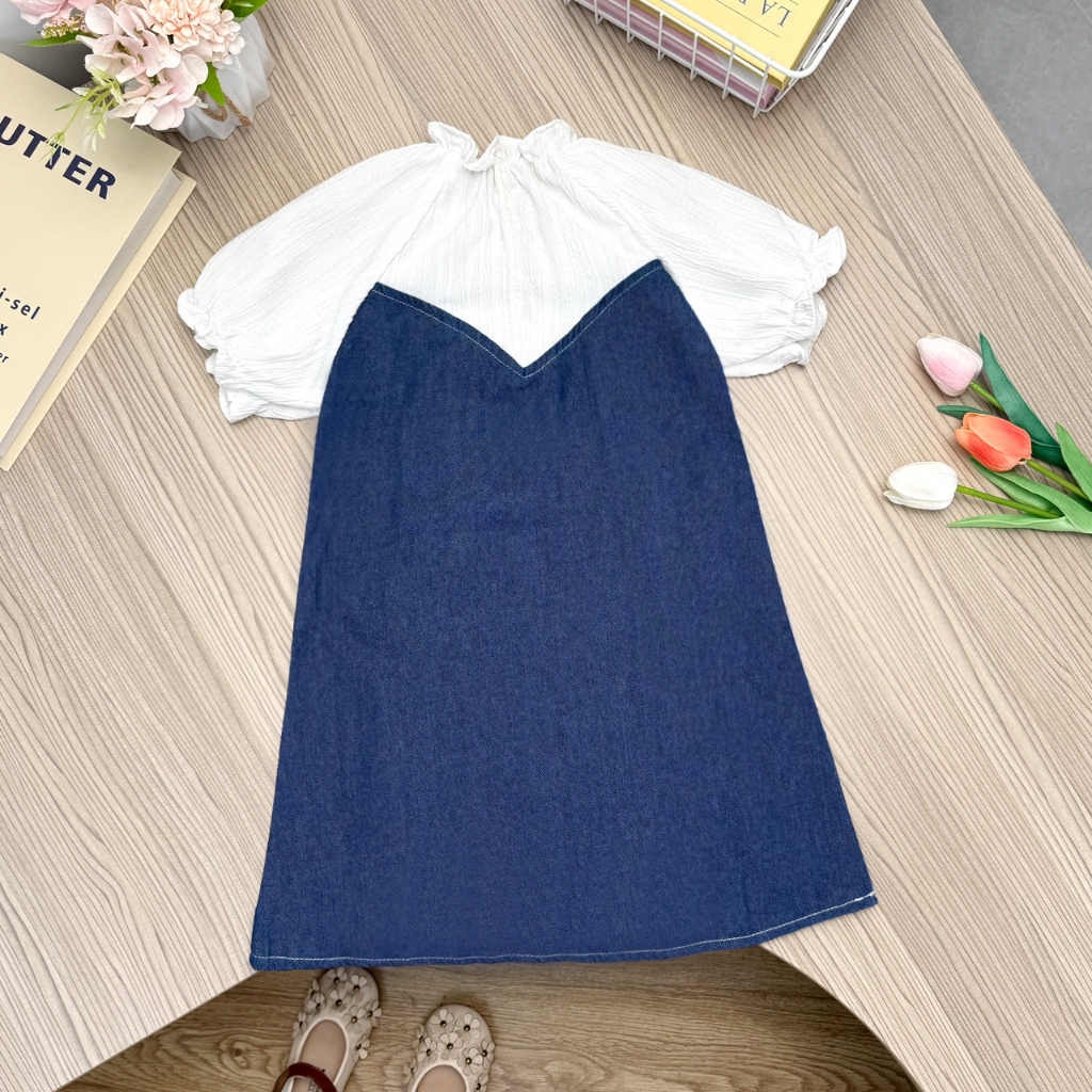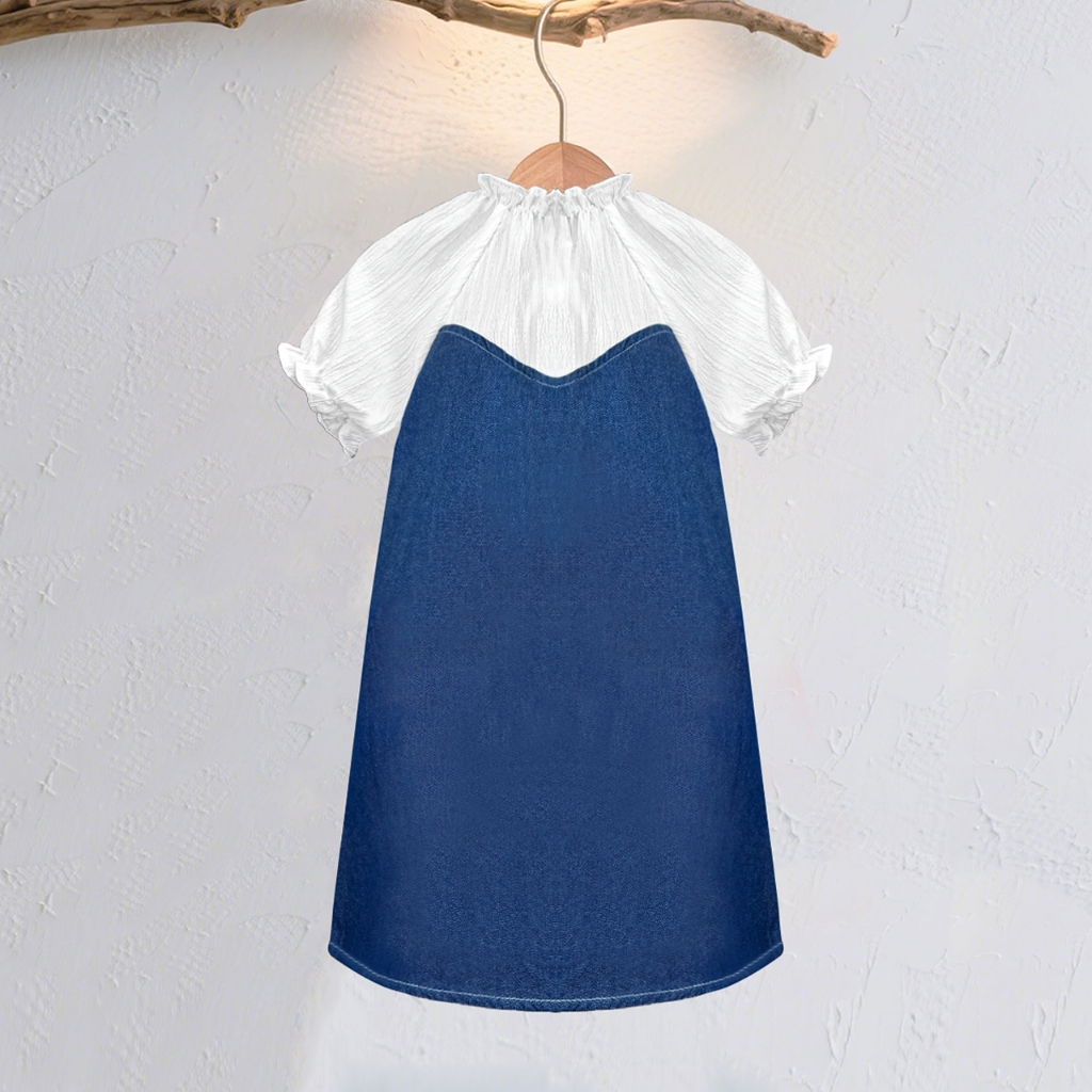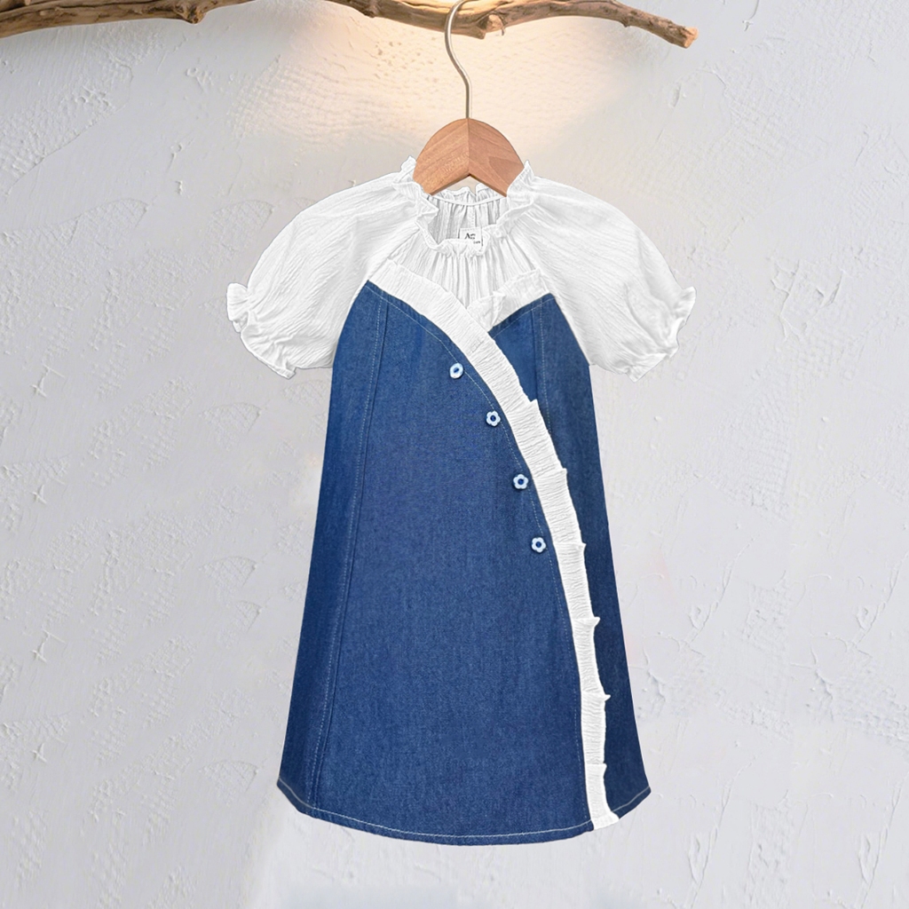 Dres Jennie Anak Perempuan Lengan Pendek Bahan Cringkle Mix Jeans Untuk Umur 2 - 6Tahun
