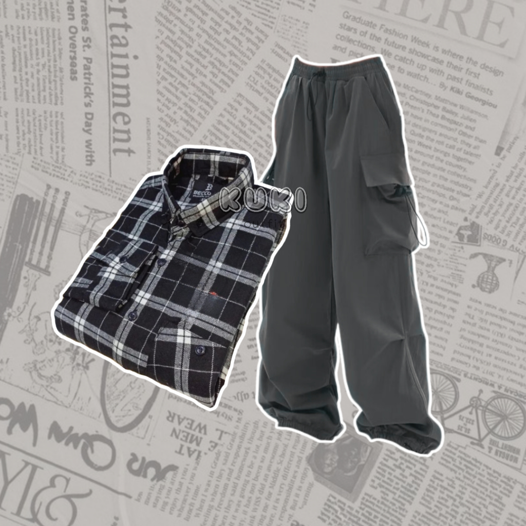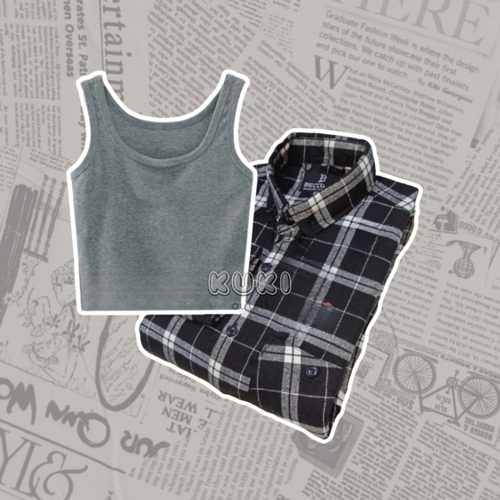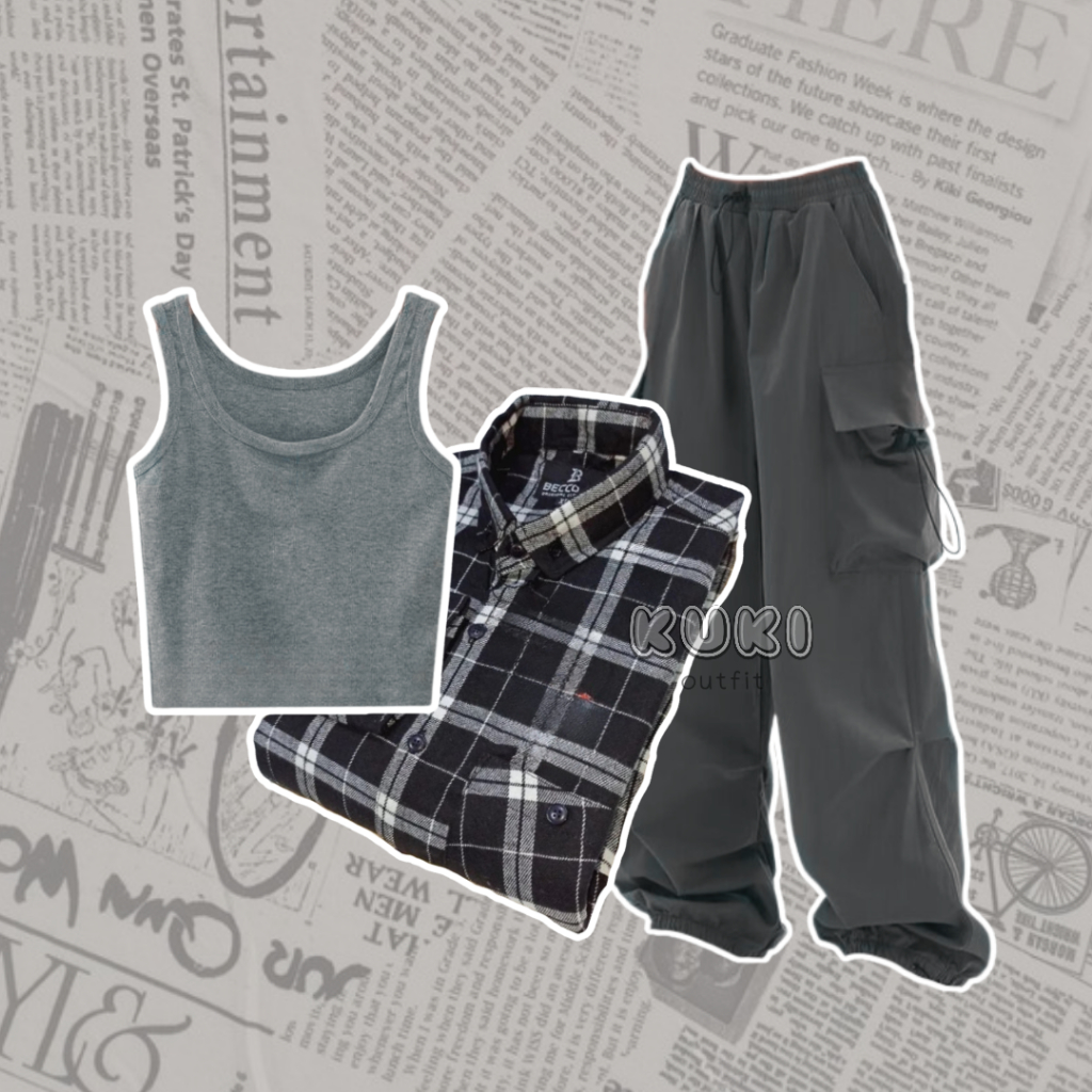 Skena Outfit One Set Wanita (Kemeja Flannel, tanktop, Celana Cargo) Oneset OOTD Korean Style - KK08