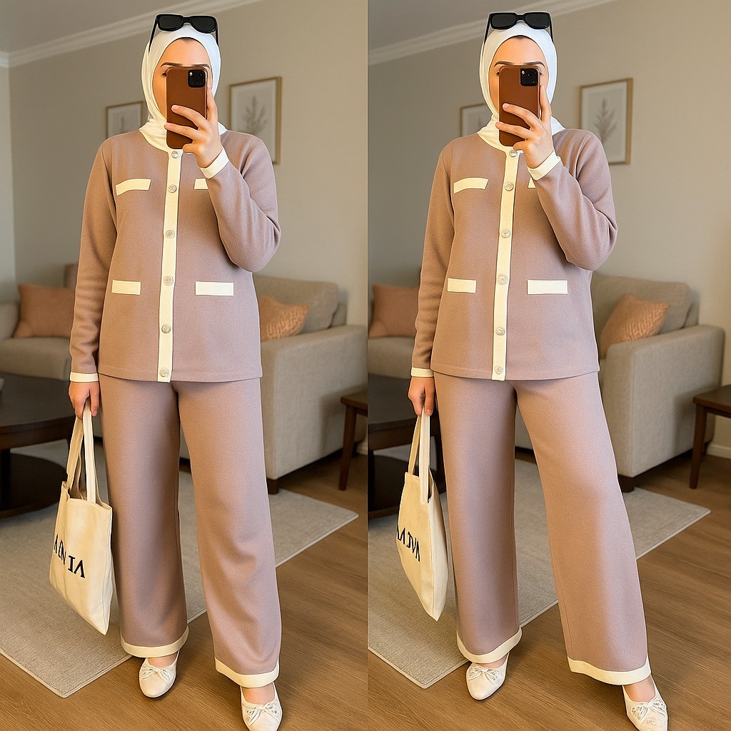 Qiana Set Wanita Muslim All Size Fit To XL Besar Matt Caramel Knit Polos Premium