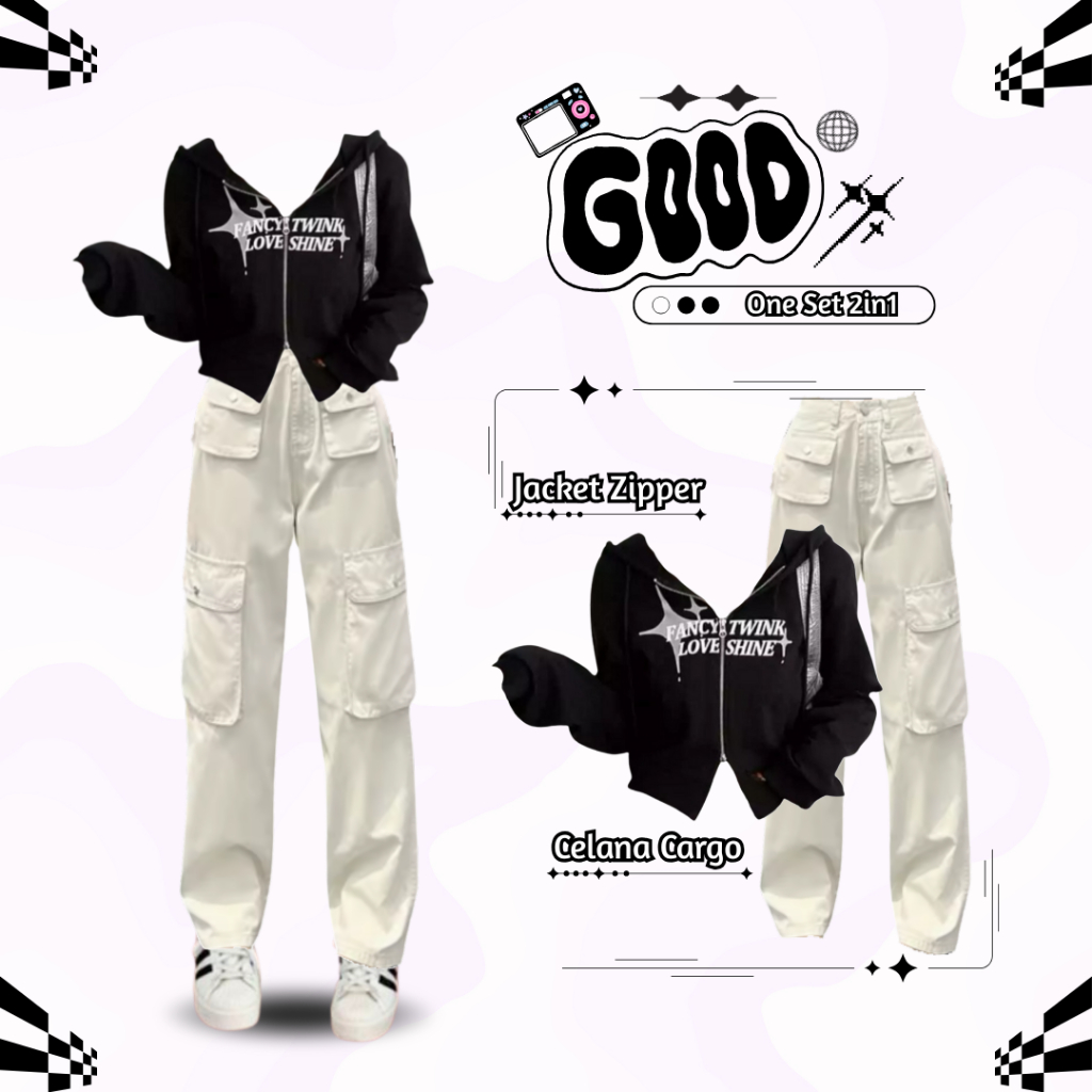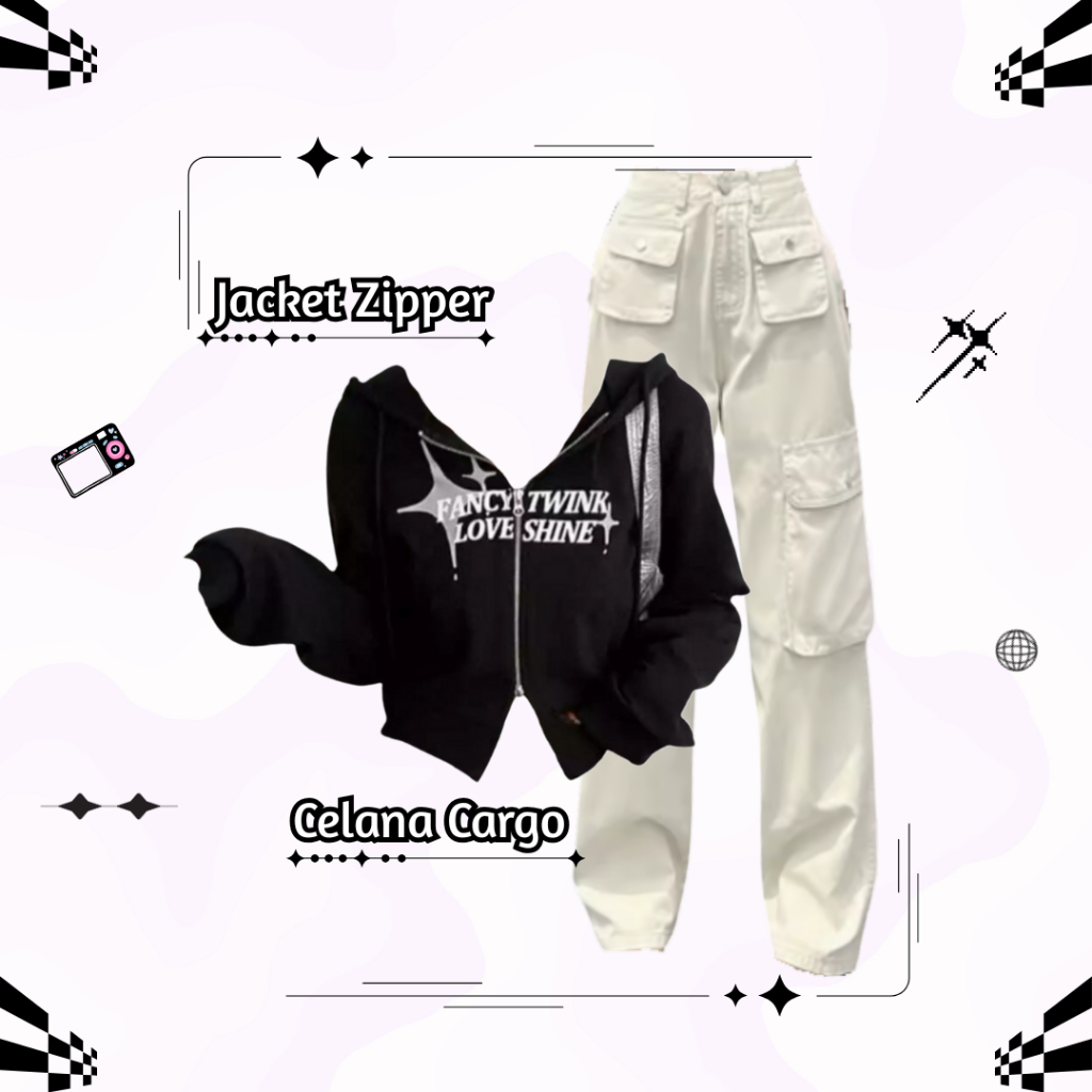 One Set 2in1 ( Celana Cargo Cream & Jaket ) Outfit Y2K Kekinian Inspirasi Ootd Skena Kalcer Korea Style HipHop BHJ119