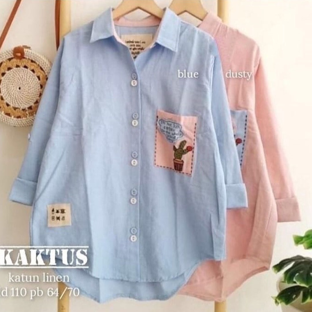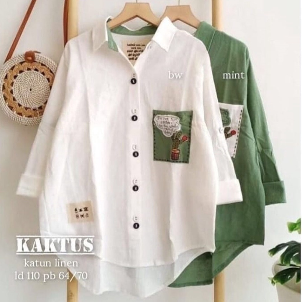 Kaktus Shirt Blouse Path Embroidery Linen Rami Baju Atasan Wanita Muslim Tunik Premium M - XL
