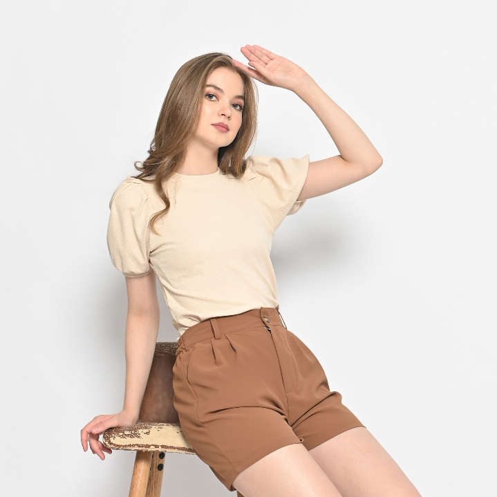 Kaos Crop Wanita 0282 Katun Knit Brickwork Vertical Stretch Lengan Pendek Balon Puff