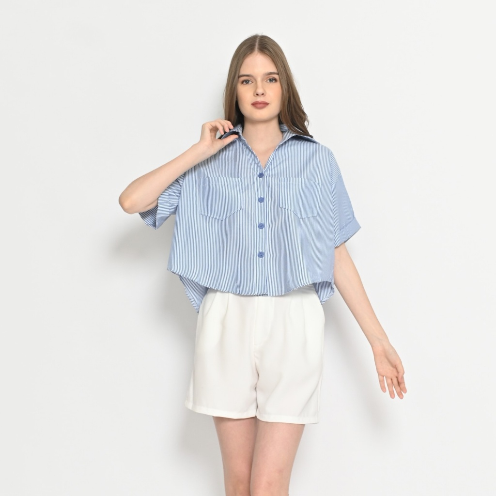 Kemeja Crop Casual Wanita 0324 Katun Jepang Salur Lengan Pendek