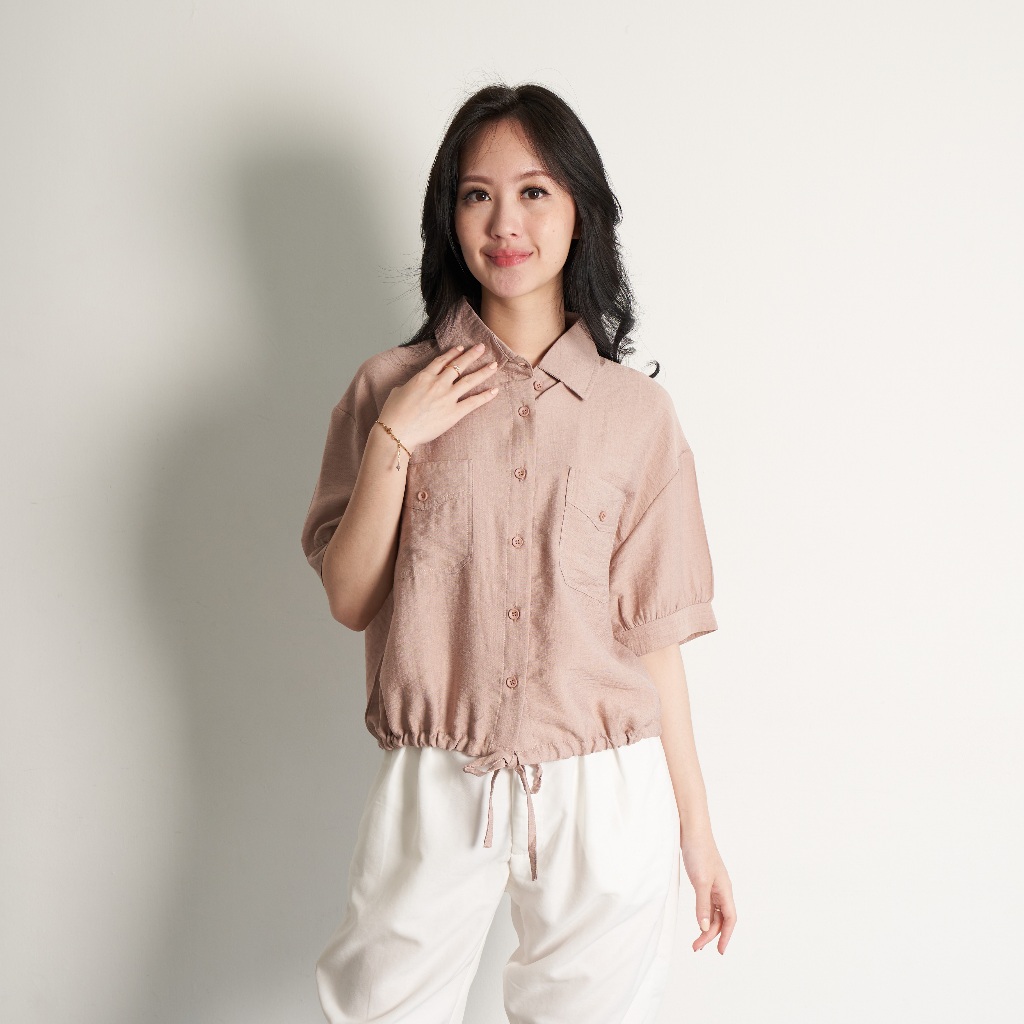 Kemeja Wanita Serut 0552 Linen Polo Polos Lengan Pendek