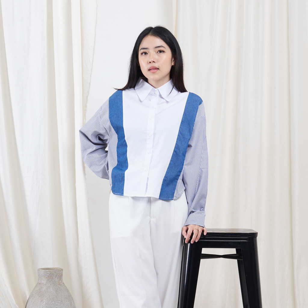 Kemeja Wanita Kombinasi 0748 Katun Twill Denim Chambray Polymicro Salur Lengan Panjang