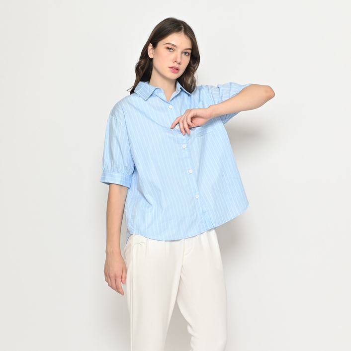 Kemeja Casual Wanita 0355 Katun Turkey Salur Lengan Pendek Balon Puff