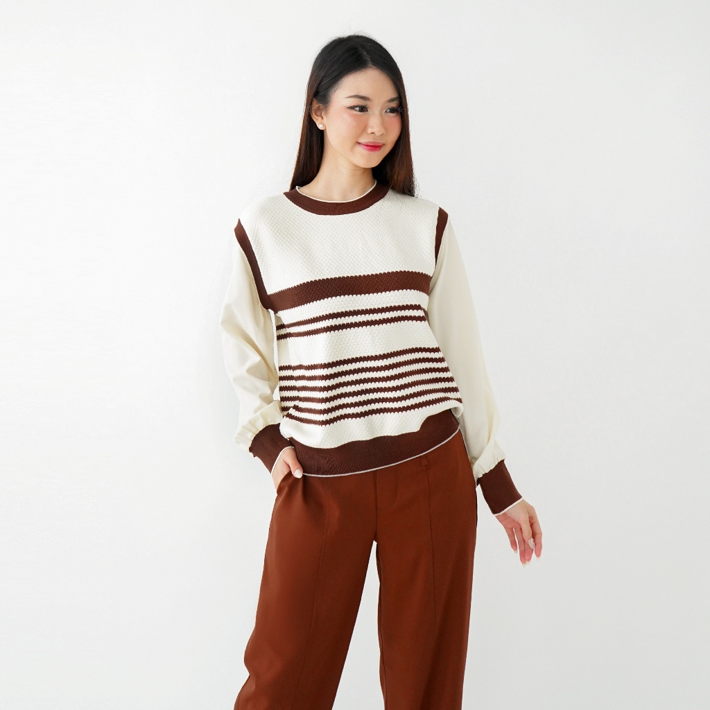 Sweater Wanita Rajut 7343 Mix Knit Motif Salur Kombinasi Sifon Polos Lengan Panjang