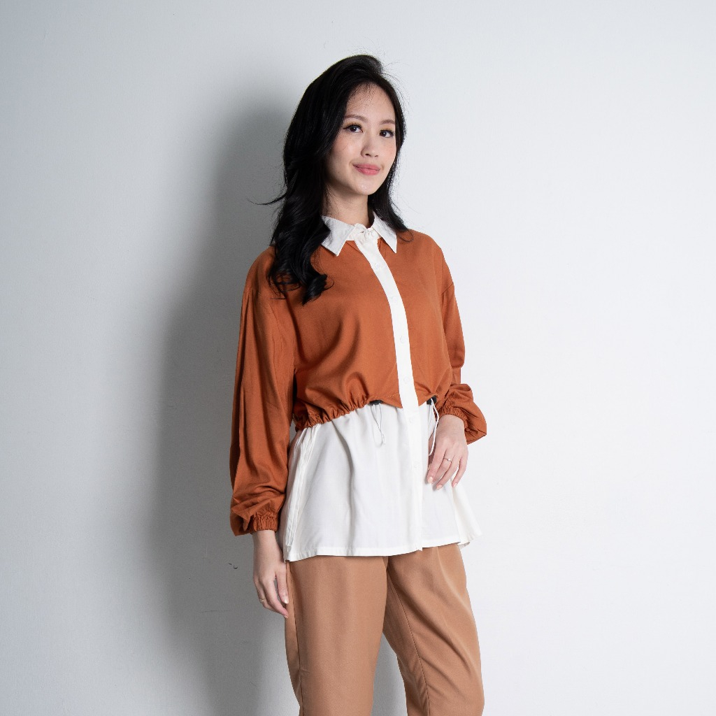 Kemeja Wanita Serut Kombinasi 0533 Katun Tenzel Primacool Polos Lengan Karet Panjang