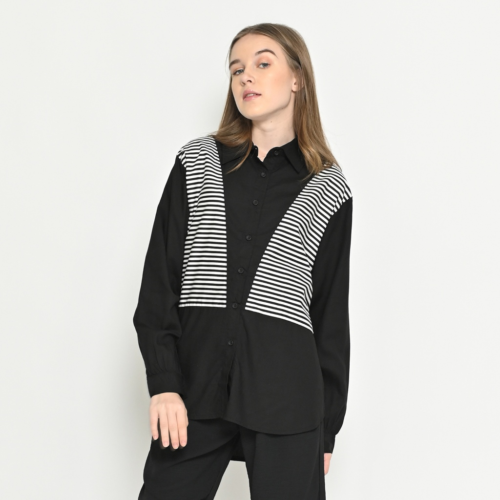 Kemeja Casual Wanita 0505 Katun Primacool Polos Kombinasi Stripe Premium Lengan Panjang