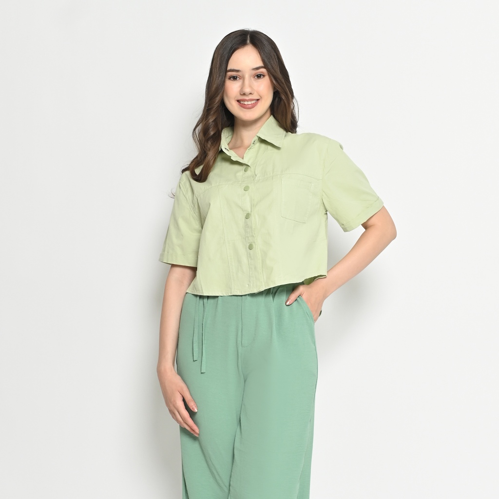 Kemeja Pocket Crop Wanita 88020 Jeans Wash Polos Lengan Pendek