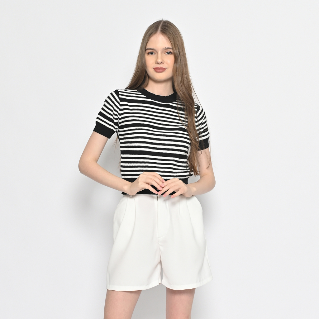 Kaos Crop Wanita 2310 Rajut Knit Stripe Strecth Lengan Pendek