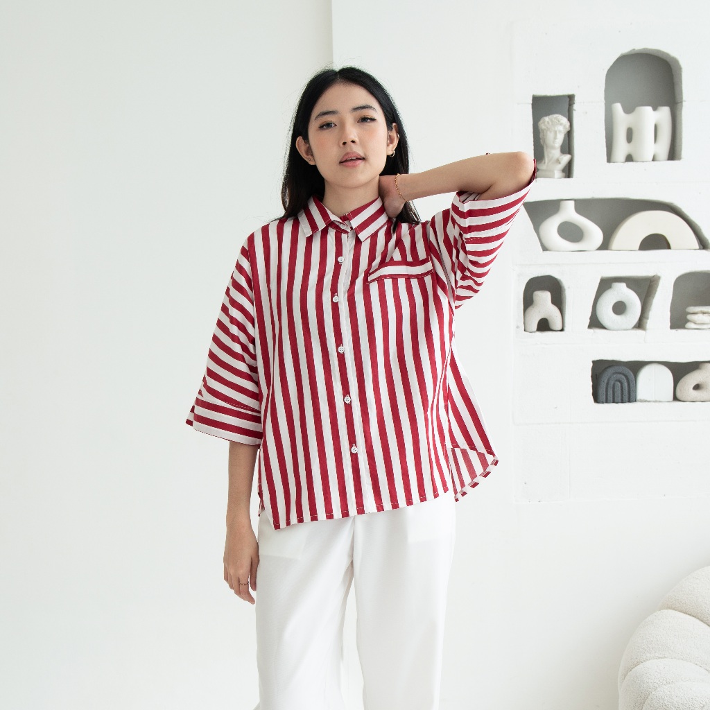 Kemeja Wanita Casual 0657 Katun Woven Motif Salur Lengan Siku 3/4