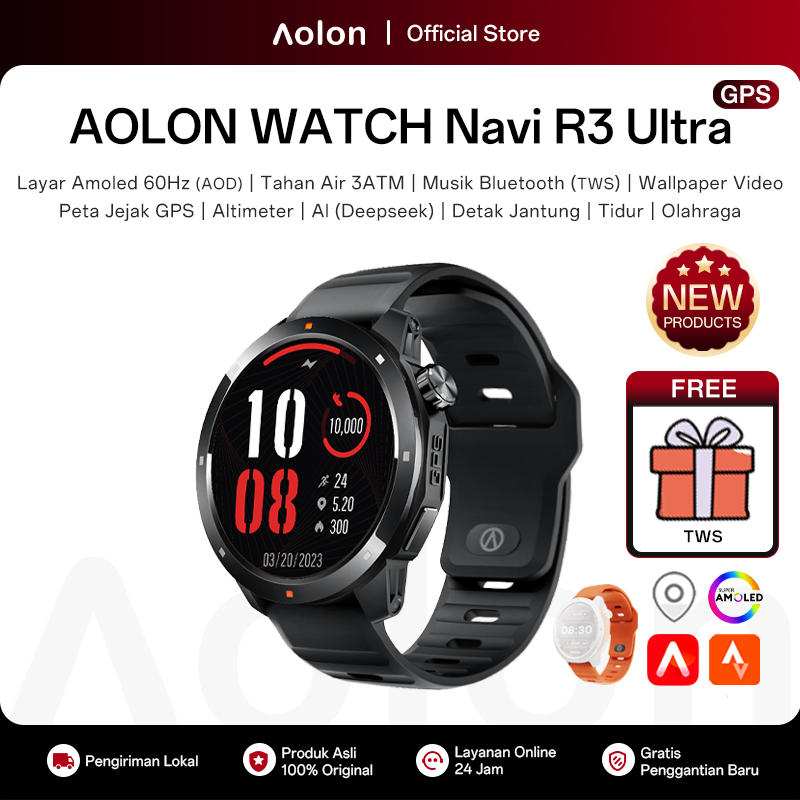 【New GPS】Aolon Navi R3 Ultra Jam Tangan Smartwatch GPS 46mm Amoled 60Hz Tahan Air 3ATM Musik Bluetooth TWS Wallpaper Vid
