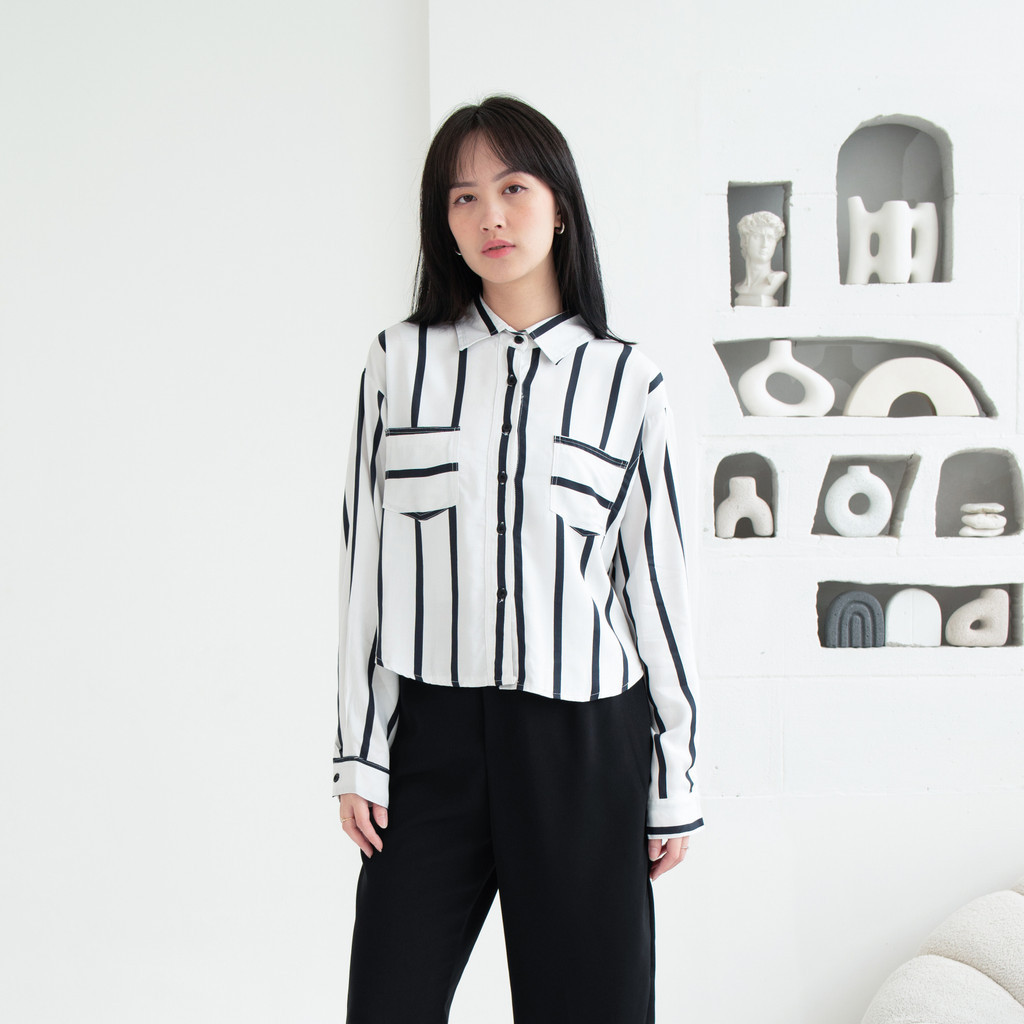 Kemeja Wanita Crop 0677 Rayon Twill Motif Salur Lengan Panjang