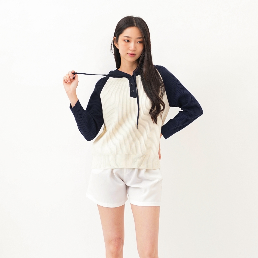 Sweater Wanita Hoodie Rajut 132 Double Rib Knit Kombinasi Polos Lengan Panjang