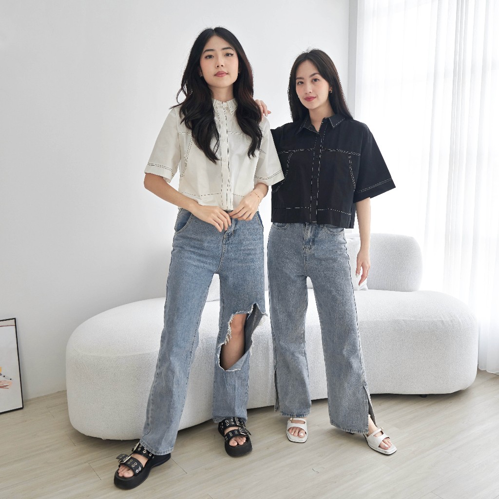 Kemeja Wanita Crop 0686 Katun Poplin Polos Lengan Pendek