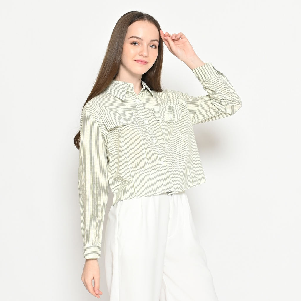 Kemeja Crop Wanita 0535 Katun Woven Salur Premium Lengan Panjang