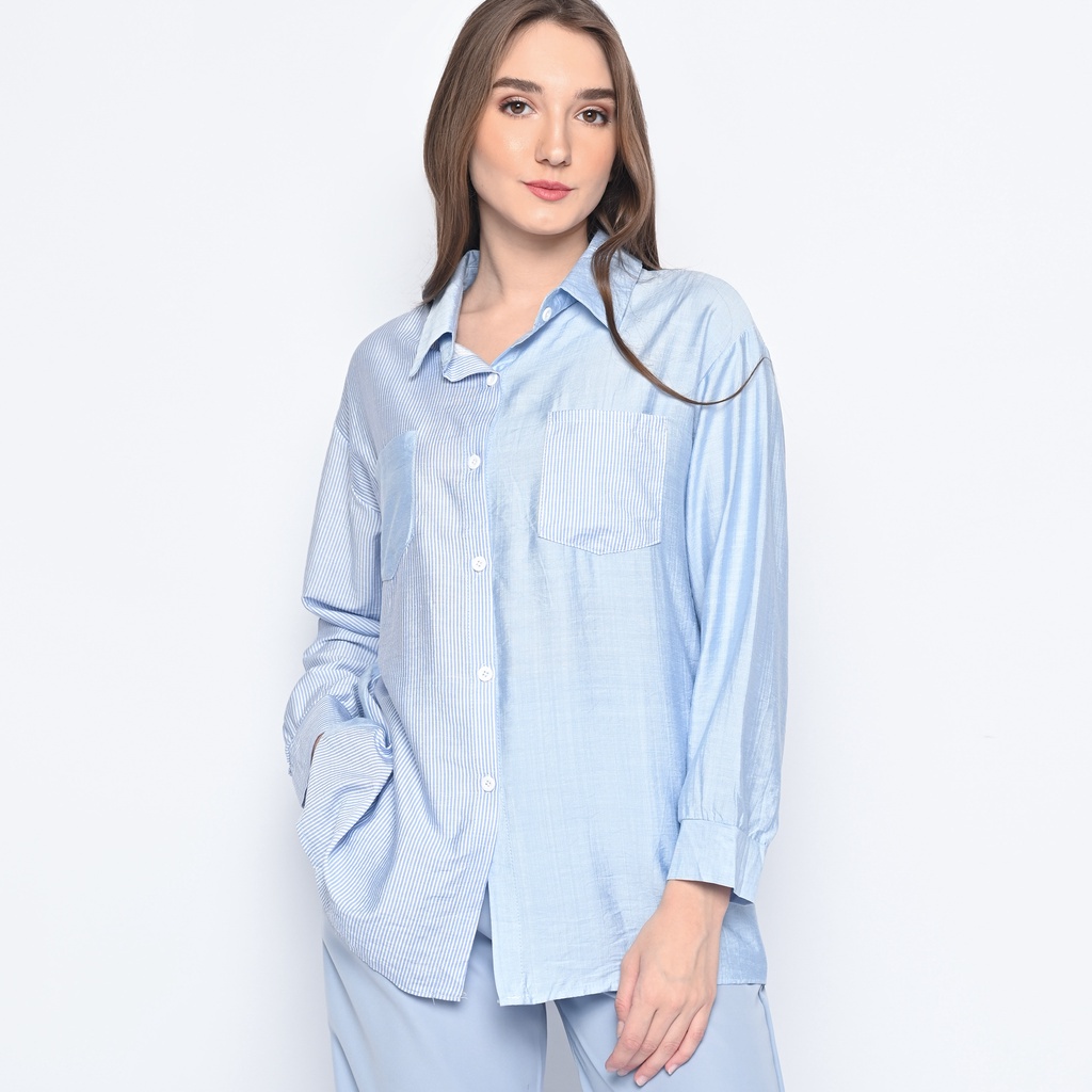 Kemeja Casual Wanita 9028 Katun Silk Salur Lengan Panjang