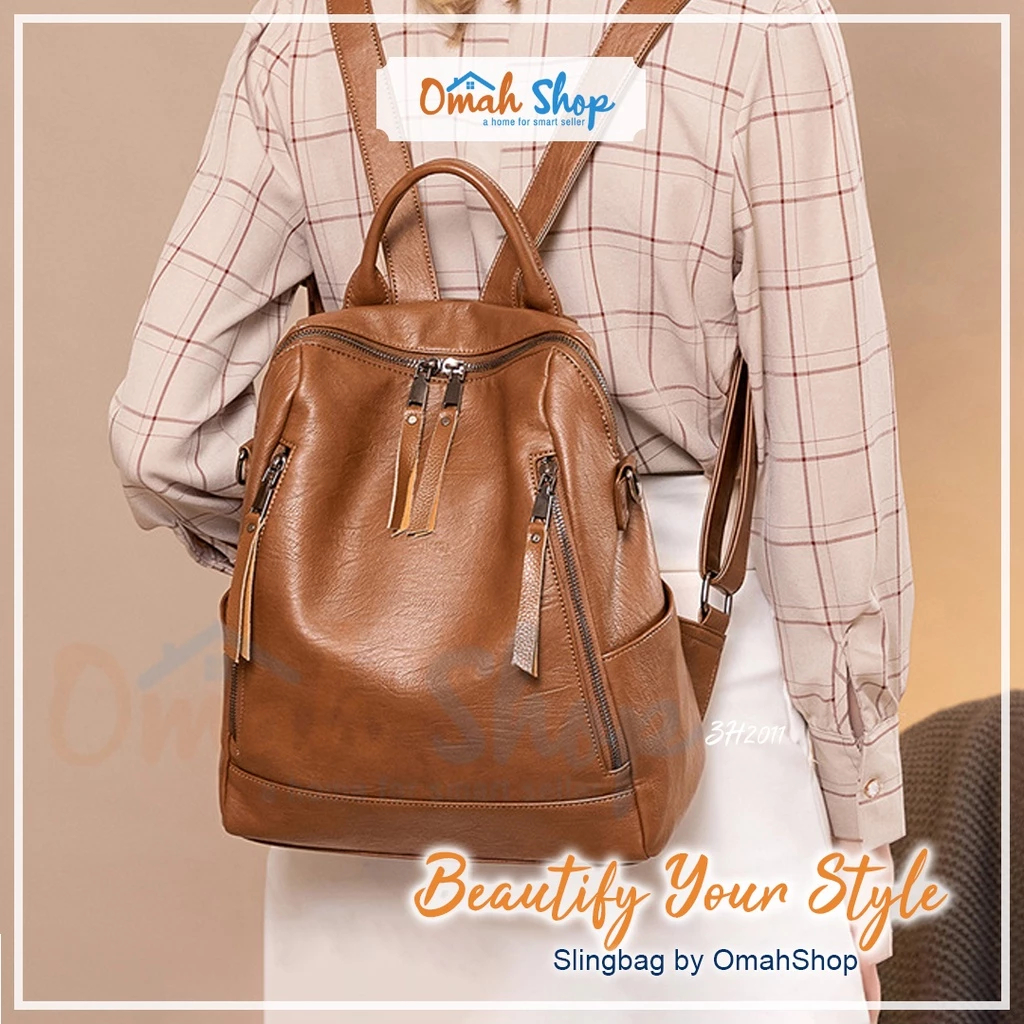 [PROMO SPESIAL] ASTA Tas Ransel Gendong Coklat Kulit PU Sintetis Polos untuk Wanita Backpack, Sekolah Kerja Tali Ransel