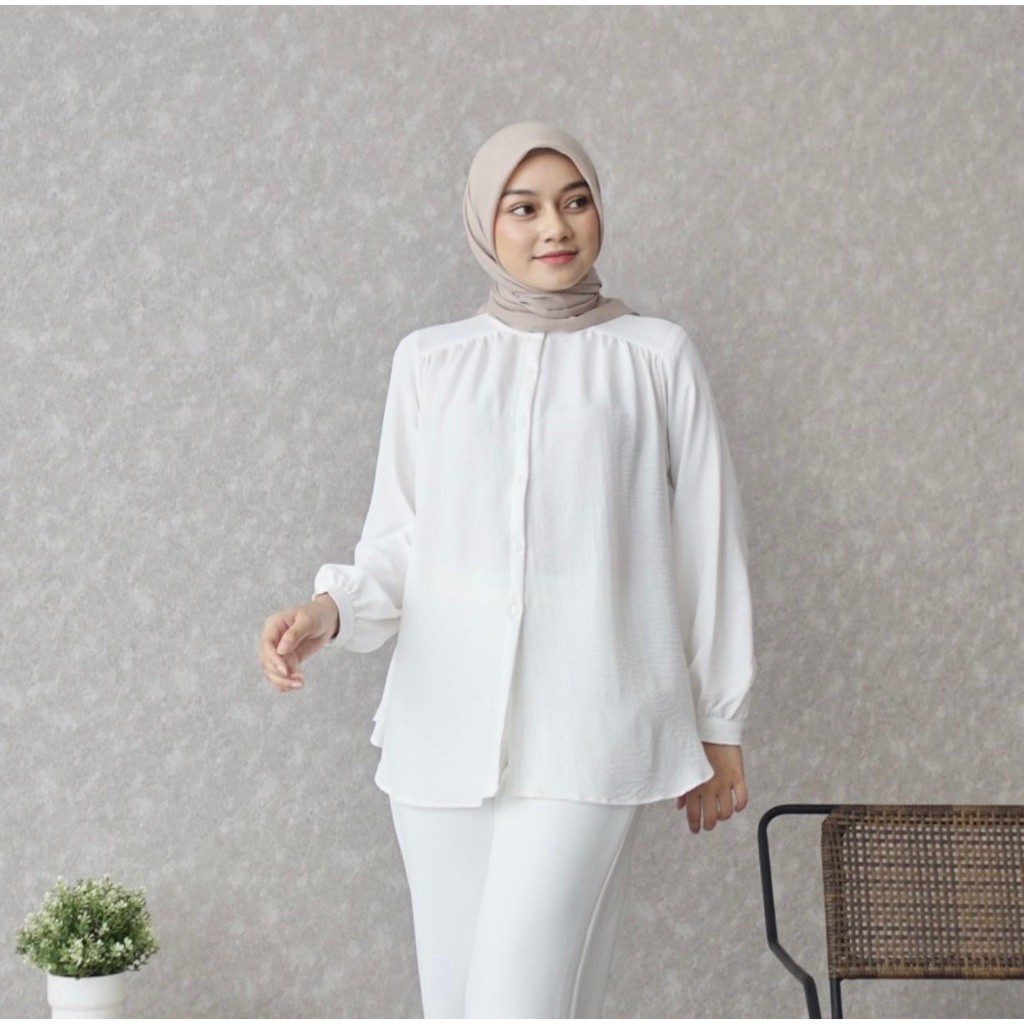 geneaby - Kemeja Alina Blouse Wanita Kerah Shanghai Crinkle Airflow Freya Skirt Lengan Panjang Full Kancing Depan Busui