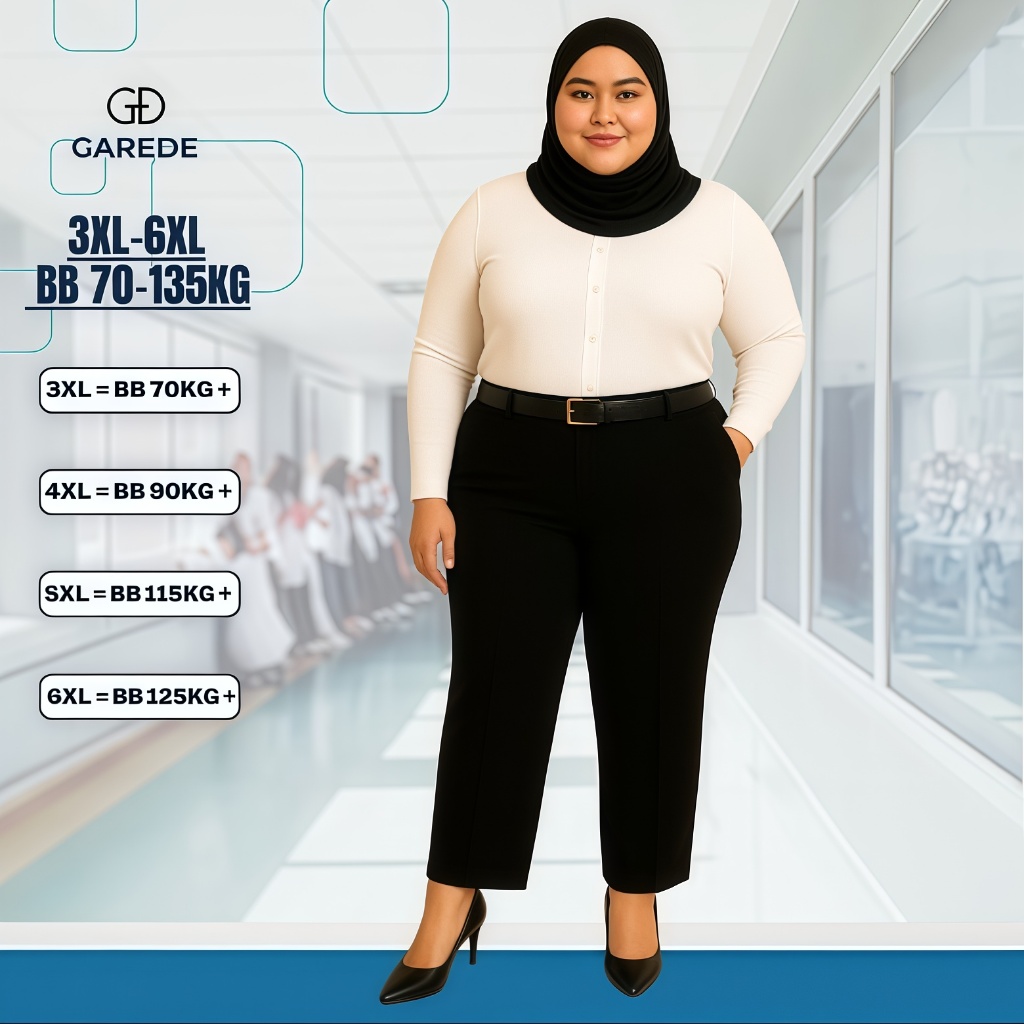 Garede - Celana Panjang Wanita Jumbo Polos Bahan Panjang Formal Kerja Kantor Pinggang Karet Hitam
