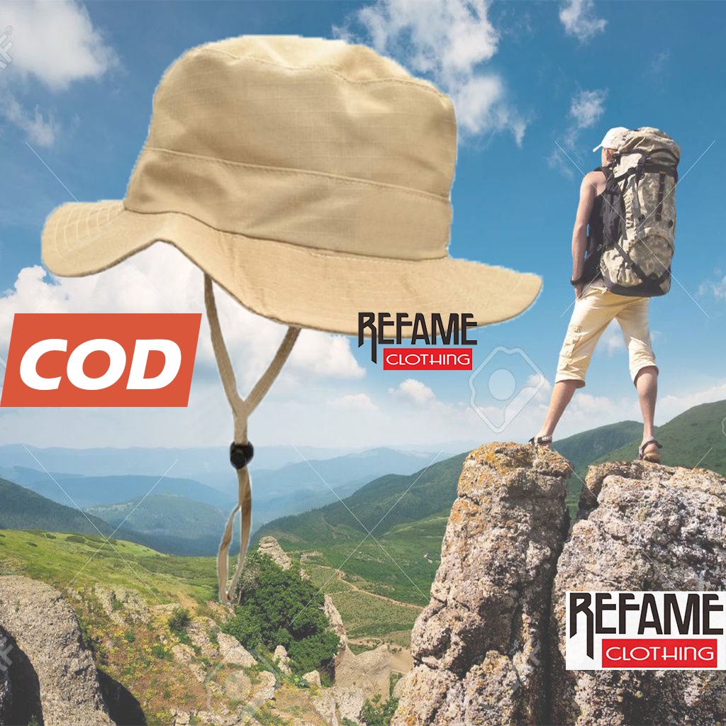 Topi Gunung Rimba Tali Hiking Hutan Camping Hat Tali Hitam Cream Hijau Army Coklat Biru Navy Merah Kuning Abu Grey Loren