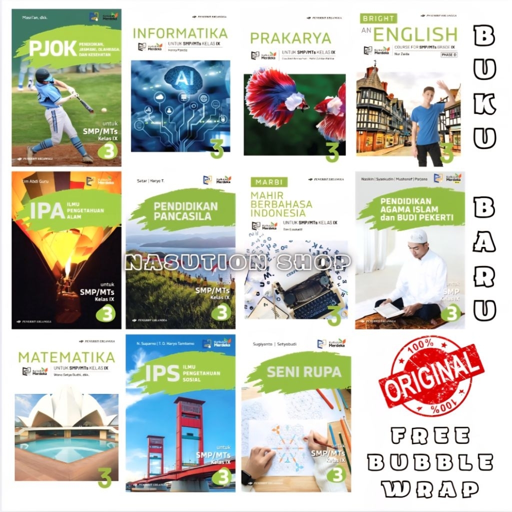 Buku Paket Kelas 3 / 9 IX SMP Erlangga Kurikulum Merdeka Km Matematika Pancasila Ipa Ips Bright Agama Marbi Pjok Informa