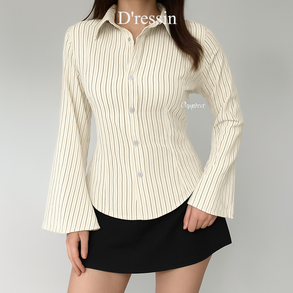Kemeja Whispie Atasan Wanita Motif Salur Garis Stripe Slim Fit Body – Lengan Flare Elegan, Kekinian