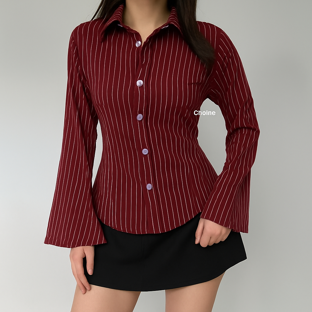 Kemeja Whispie Atasan Wanita Motif Salur Garis Stripe Slim Fit Body – Lengan Flare Elegan, Kekinian