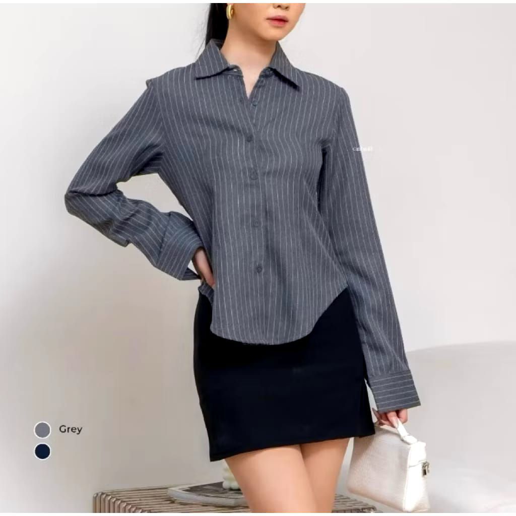 Luna Strip Fitted Shirt Kemeja Wanita Salur Garis Long Sleeve Slim fit Boddy - Atasan Kemeja Wispie Wanita Basic Casual