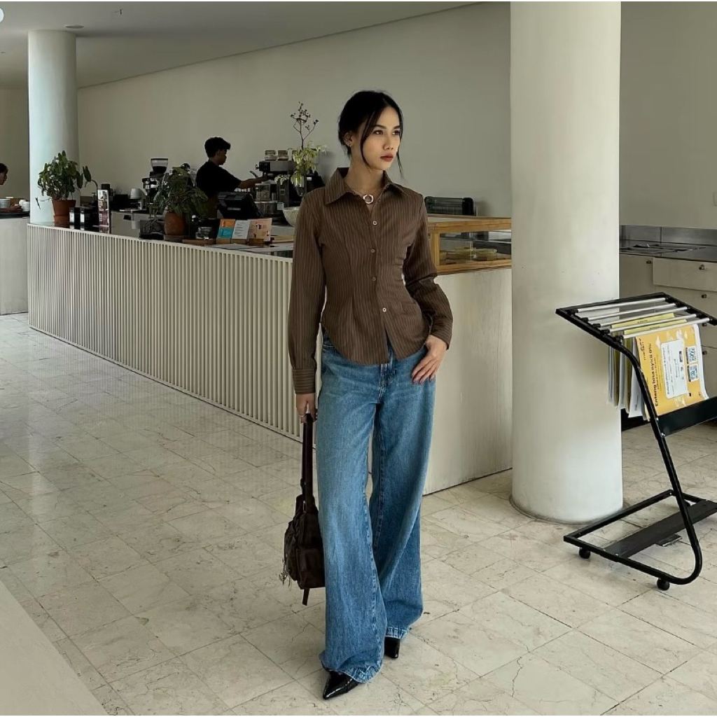 Nouna Girls Boss Fitted Shirt | Kemeja Fitted Stripe Wanita - Atasan Kemeja Fitted Shirt Belakang Karet