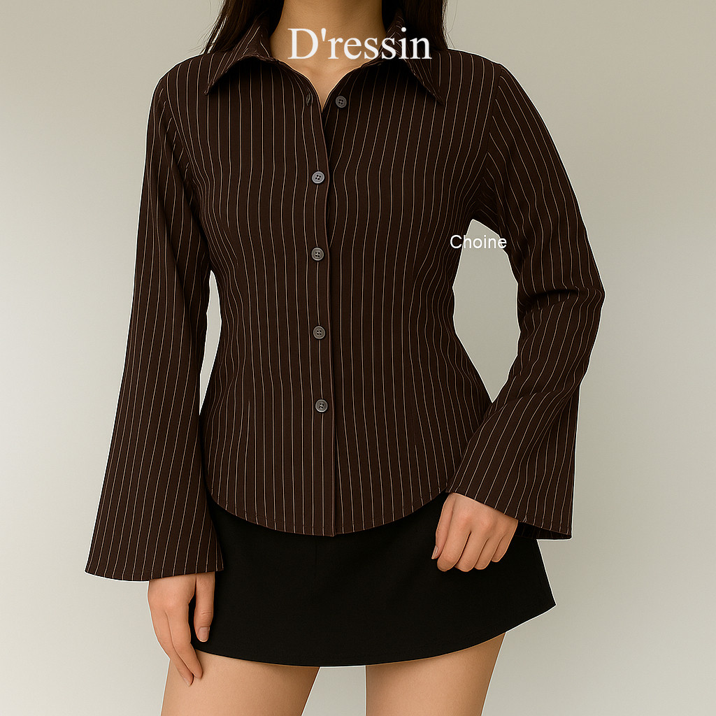 Kemeja Whispie Atasan Wanita Motif Salur Garis Stripe Slim Fit Body – Lengan Flare Elegan, Kekinian
