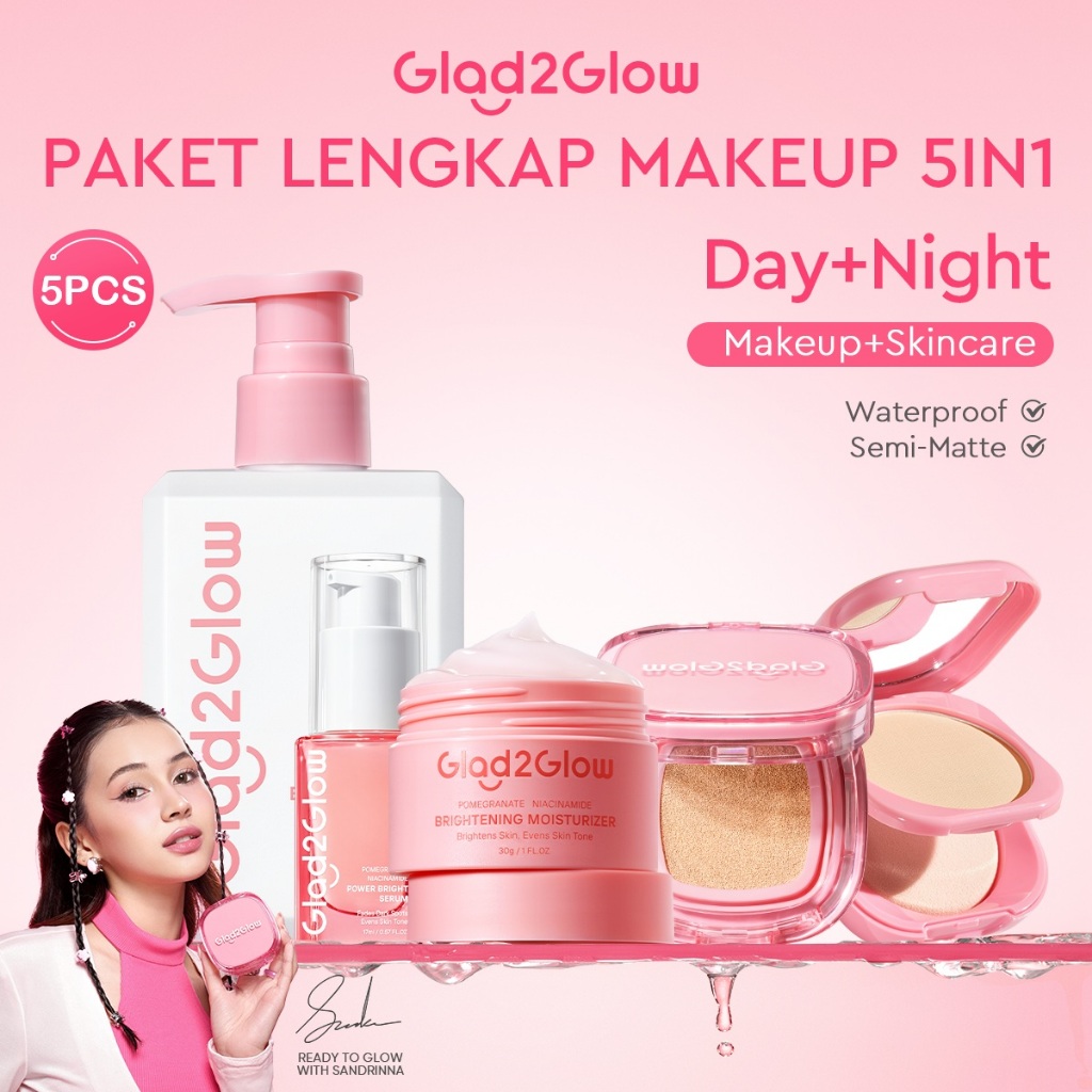 【Paket Lengkap Makeup 5in1】Glad2Glow Makeup Skincare Day Night Set | Perfect Cover Cushion 11g+Blurring Powder Foundatio