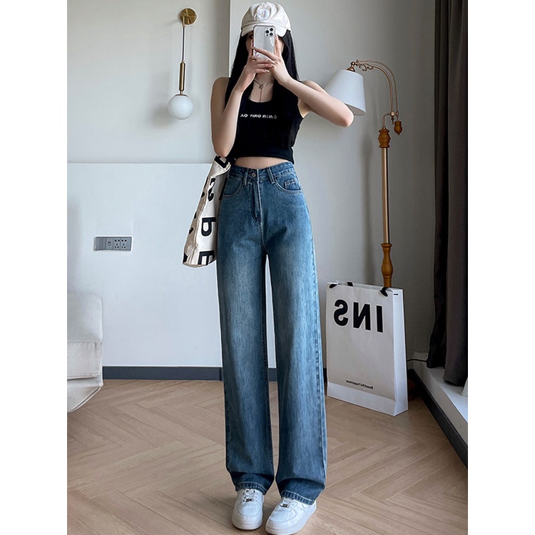 Biru Retro Hight Waist Kulot Celana Jeans Wanita Korea