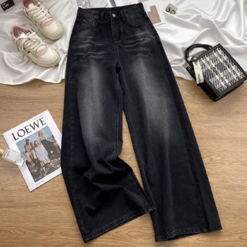Celana Jeans Wanita High Waist Wide Leg Loose Fit Vintage Korea Streetwear Baggy Pants Kekinian