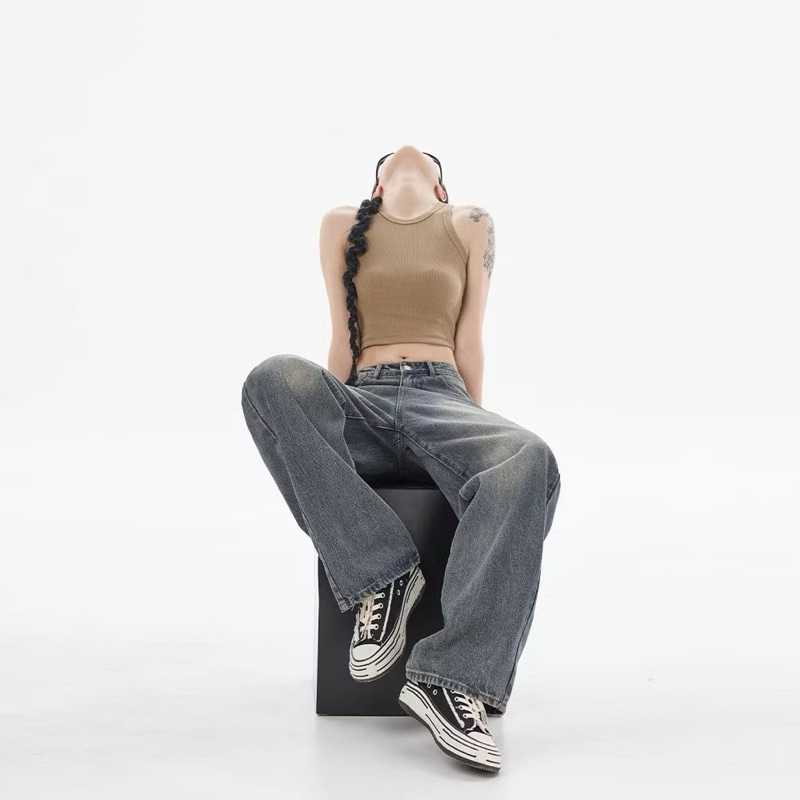 Biru retro Highwaist Celana Jeans Wanita Loose Kekinian