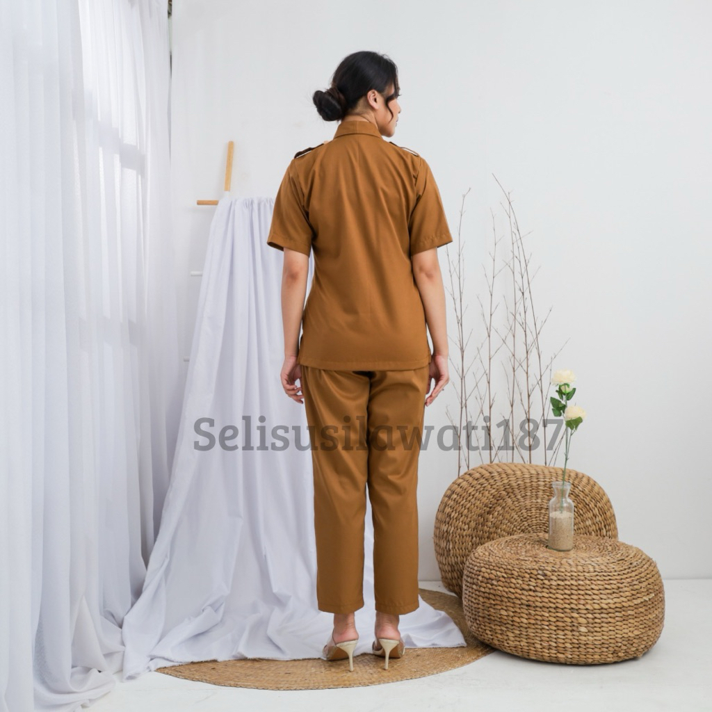 Seragam Khaki Pns wanita Baju dinas Pemda Kemeja Saku dada Lengan Pendek