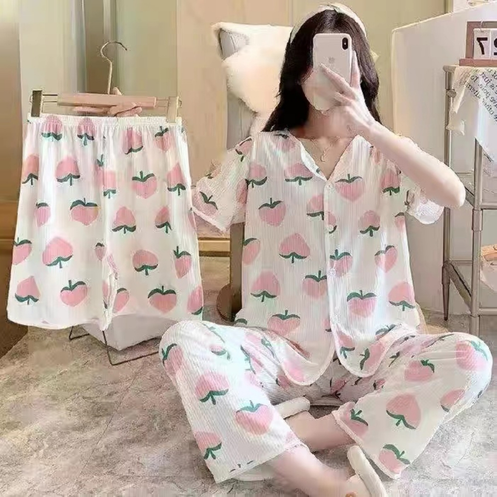 MK Baju Tidur Wanita Piyama Set Cewek 3 IN 1 Adem Dipakai Seharian Bahan Katun Premiun Tipis MK 005