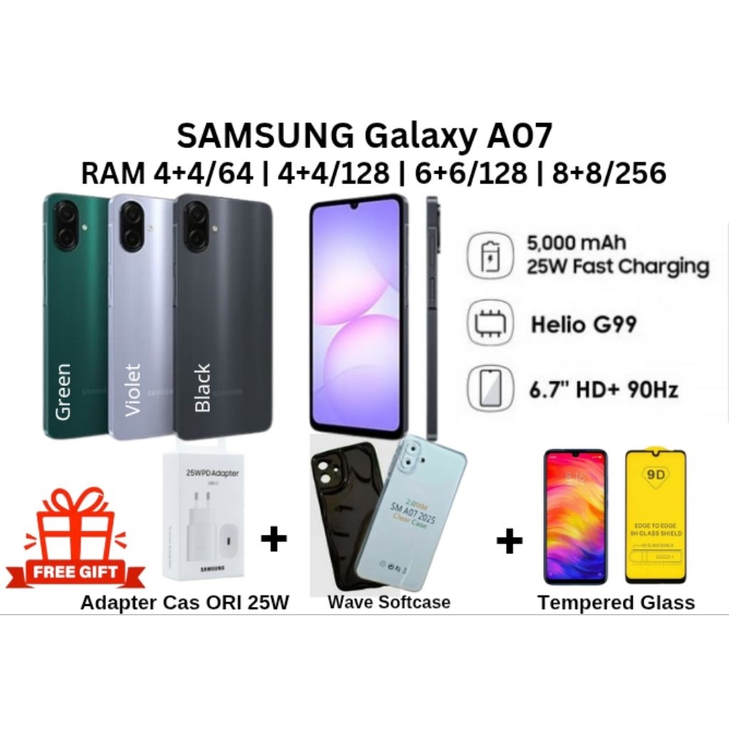 SAMSUNG GALAXY A07 8/256 6/128 4/128 4/64 SAMSUNG A 07 RAM 8+8GB I 6+6GB I 4+4GB ROM 256GB I 128GB I 64GB HELIO G99 GARANSI RESMI