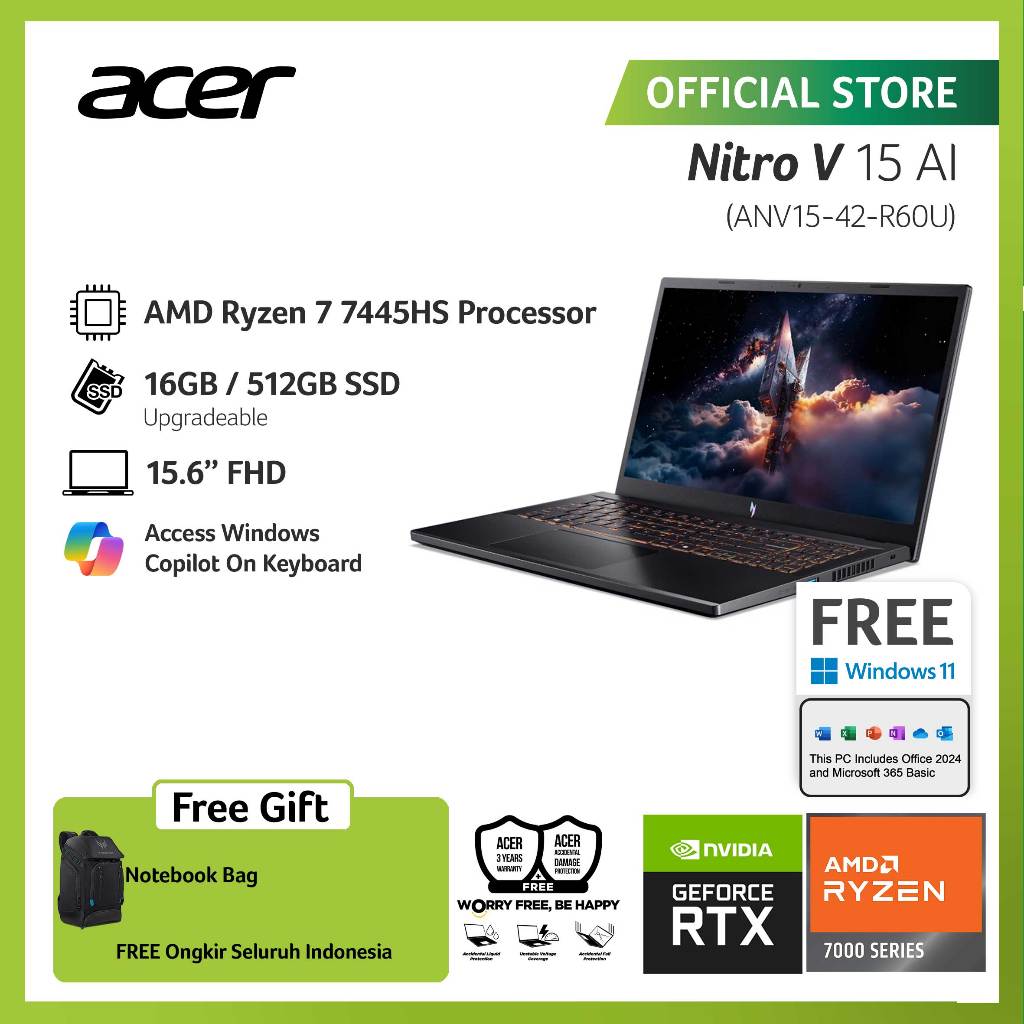ACER NITRO V 15 ANV15-42-R60U NVIDIA GEFORCE RTX 4050 15.6" FHD IPS AMD RYZEN 7 7445HS RAM 16GB ROM 512GB SSD W11